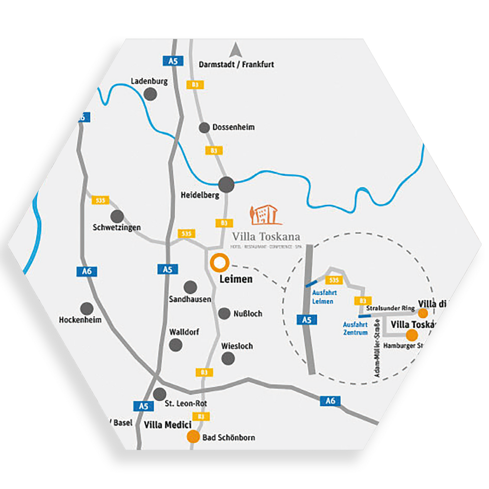 Von der A6 kommend, nehmen Sie die Ausfahrt 32-Wiesloch/Rauenberg und biegen rechts ab auf die L723. Nach ca. 2km biegen Sie links ab auf die B3 Richtung Heidelberg. Nach ca. 8km fahren Sie bei Leimen/Zentrum ab und nehmen im Kreisel die zweite Ausfahrt. Die erste Abbiegung nach rechts (Adam – Müller – Straße) und gleich die erste wieder links (Hamburger Straße).